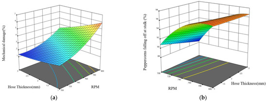 - The reliability of the theoretical results was verified by the crash test bench. In the research results, the impact of three factors on the damage rate to the pod peppers is listed in descending order: rotational speed, hose thickness, and moisture content. The impact of three factors on the rate of stem shedding in pod chili peppers, from highest to lowest, is as follows: rotational speed, thickness of the hose, and moisture content in pod chili peppers. This study determined the optimal experimental parameters for the harvesting process of the pod pepper, with a rotational speed of 705.04 rpm, a hose thickness of 3 mm, and a moisture content of 71.27%. The research results are of great significance for improving the structural parameters and motion parameters of the pod pepper harvester and increasing the income of farmers in planting pod peppers. These results are also of great significance for in-depth research on the pod pepper-harvesting device in the future.