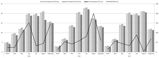 This study used weather data from 2020–2022 recorded by the IMT200 Weather Station (iMETOS®ag) (Pessl Instruments GmbHWeiz, Austria) located in Piotrowice Wielkie (51°20′37.6″ N 22°24′33.2″ E), 11 km away from the experimental field. The weather conditions in 2020–2022 are shown in Figure 1. The total rainfall for the period from March to September was comparable between the first and second growing season. During these years, abundant precipitation was separately recorded in both September and August. The mean temperature was the lowest in 2022, slightly higher in 2021 and highest in 2020. Overall, the weather in 2022 was warm but very dry.