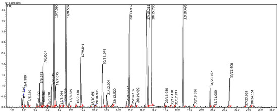 The quantitative composition of essential oils was determined at the Department of Chromatography, Maria Curie Sklodowska University in Lublin, Poland. Qualitative analysis of essential oils was performed using GC/MS QP2010 (Schimadzu, Kyoto, Japan) equipped with a ZB5-MSi fused silica capillary column (30 m × 0.25 mm id. 0.25 μm film thickness, Phenomenex, Aschaffenburg, Germany). Helium grade 5.0 was used as the carrier gas (1 mL/min). The injection temperature was 310 °C, and the volume of injected sample was 1 μL. During injection, the split mode was applied (purge time—0.7 min). The following temperature program was used: 2 min at 50 °C and then linearly raised at a rate of 5 °C/min to 310 °C. A mass spectrometer was operated in EI mode at 70 eV. The temperature of ion source was 220 °C. The mass range was from 35 to 450 amu. Qualitative analysis was performed by comparing the retention indices and MS spectra for the obtained peaks with the analogous data from the mass spectrometry library (NIST’14). Quantitative analyses were carried out using a gas chromatograph with a flame ionization detector, GC/FID GC2010 (Schimadzu, Kyoto, Japan). Hydrogen was used as the carrier gas (1 mL/min). The experimental conditions were the same as for GC/MS. Peak identification was performed based on experimentally determined retention indices.