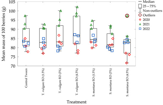 The results were statistically analysed using a two-way analysis of variance (ANOVA), to examine differences in the mean values of examined parameters between groups. Treatments (regarding the type and concentrations of EOs), the study year effect and interaction between treatment and the study year were used as factors. Tukey’s HSD test at a significance level of p < 0.05 was used to determine individual differences between the mean values of the parameters tested in each group. The results in the tables are presented as arithmetic means with standard deviation (SD). The distribution of the obtained results was also presented in box plots. Each measurement was performed in three replicates. Tibco Statistica for Windows, v14 (StatSoft Sp. z o.o., Krakow, Poland), 2020 was utilised for all analyses.