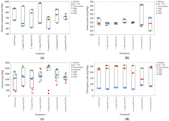 Changes in the content of phenols (a), anthocyanins (b), tannins (c) and chlorogenic acid (d) in chokeberry fruits after treatments with T. vulgare and S. montana EOs in 2020–2022.