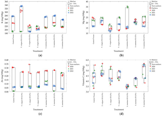 Changes in potassium (a), magnesium (b), zinc (c) and vitamin C (d) content in chokeberry fruits after treatments with T. vulgare and S. montana EOs in 2020–2022.