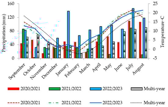 Weather conditions varied across different seasons (Figure 1). In September 2020, rainfall was below the long-term average. On the other hand, in 2021, very low rainfall occurred in October. Significant variations in precipitation were observed in January compared to the long-term average, especially in 2023. From January to August 2023, precipitation levels were higher than the long-term average. On the other hand, in 2022, precipitation from May to August was below the long-term average. In the autumn months of each year, air temperatures were high or close to the long-term averages. Similarly, in the winter months, there were no temperature drops below the long-term average. In the spring and summer months, temperatures fluctuated both above and below the long-term average.
