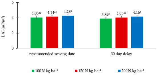 The Leaf Area Index (LAI) one side green area per 1 square meter of soil had the lowest value in the variant with delayed sowing and fertilization with a nitrogen dose of 100 kg ha−1. Significantly higher LAI measurements were observed after the application of a nitrogen dose of 200 kg ha−1 (Figure 2). The effect of variable nitrogen fertilization was modified by the sowing date, which was demonstrated by a significant interaction between the factors studied.