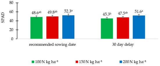 As expected, the SPAD index increased with the rise in nitrogen dose; however, significant differences were demonstrated only between the variants with a nitrogen dose of 200 kg ha−1 and the variant with delayed sowing and a nitrogen dose of 100 kg ha−1 (Figure 3).