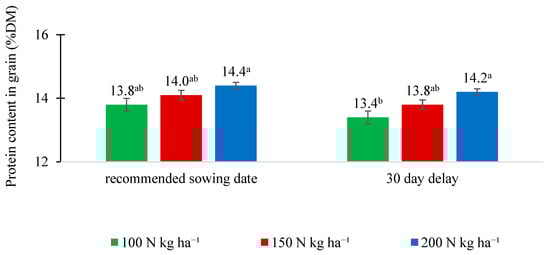 Sowing grain with a 30-day delay and applying a nitrogen dose of 100 kg ha−1 resulted in a reduction in the protein content in the grain. A significantly higher protein content in the grain was obtained after fertilization with a nitrogen dose of 200 kg ha−1, regardless of the sowing date (Figure 4).
