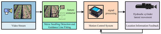The intelligent inter-row weeding equipment extracts real-time seedling and weed information from the field through a camera, performs image recognition processing to accurately distinguish seedlings, weeds, and soil, and locates the positions of seedlings. Using maize seedling crop rows as a reference benchmark, computer vision technology is introduced to fit the center lines of two crop rows, and calculate the middle position between the two lines as a guide line. The lateral movement of the weeding machine is controlled and adjusted using the guide line as a reference. The weeding machine’s execution mechanism automatically adjusts its lateral position as the vehicle deviates, maintaining a safe distance from the crop rows. The computer processes relevant information and sensors feedback, issues control signals, and drives the weed removal equipment to complete tasks such as lateral movement, turning, weed removal, and seed avoidance. The hydraulic system outputs control signals, and the hydraulic cylinder, as the actuator of the closed-loop control system, adjusts the lateral displacement of the weeding wheel accordingly to avoid damaging the maize seedlings. The schematic diagram in Figure 2 illustrates the weed control principle of the inter-row weeding machinery.