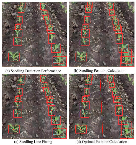As shown in Figure 3b, the dots in the bounding box represent the position of the detected maize seedlings. This step is to calculate the positions of the seedlings and represent them with coordinates. The geometric center of the bounding box can represent the position of the maize seedlings, as they are uniformly distributed around the plant stem during image acquisition. For the maize seedling line fitting, in the two crop rows in the ROI processing area, the coordinates of the maize seedlings in the crop rows were extracted, and linear fitting was adopted for the seedling target detection coordinates, as shown in Figure 3c. In this step, crop row bending diagnosis and guide line extraction were achieved. As the ultimate goal is to automatically control the lateral offset of the weeding mechanism to prevent them from damaging the seedlings, the optimal position of the weeding mechanism was calculated. In Figure 3d, the red midline is marked as the trajectory of the optimal position as the navigation line.