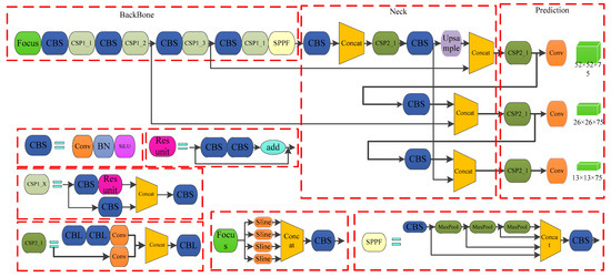The structure of the YOLOv5s model consists of four parts: a convolutional network-based backbone main network [30], which mainly extracts feature information of the image; a head detection head, which mainly predicts the target box and predicts the target class; a neck between the main network and the detection head; and a prediction layer that outputs the detection result, predicting the target detection box and label category, as shown in Figure 4.