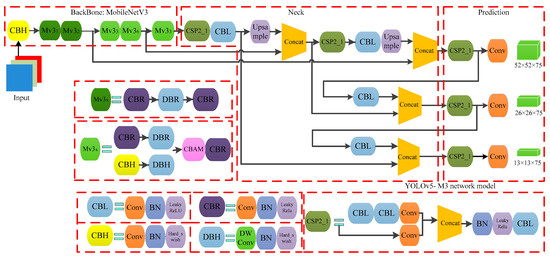 YOLOv5-M3 is an end-to-end detection framework based on regression idea, and the network model is shown in Figure 5. MobileNetv3 is used as the backbone network of YOLOv5s to extract features, and the performance and running time of the model are studied. MobileNetv3 is improved to design the model lightweight, and CBAM attention mechanism is used to replace SENet module in the network model to optimize the accuracy of target detection and strengthen the focus on the detection target, thus reducing the decline of detection accuracy caused by the complex environment. The designed YOLOv5-M3 network model uses depthwise separable convolution to replace standard convolution, further reducing the model complexity, improving training efficiency and inference speed.