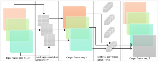 MobileNetV3 released in 2019 combines part of the structures of V1 and V2 [40], integrates, optimizes, and deletes the network layers with high computational cost in the V2 system, and introduces the SE-Net (squeeze-and-excitation networks) lightweight attention structure without sacrificing accuracy while consuming low resources [41]. DSC (Depthwise Separable Convolution) consists of depthwise convolution (DW) and pointwise convolution (PW), as shown in Figure 6. Compared with traditional convolution, DSC reduces parameters and calculation greatly, and the comparison of calculations is shown in Formula (1):