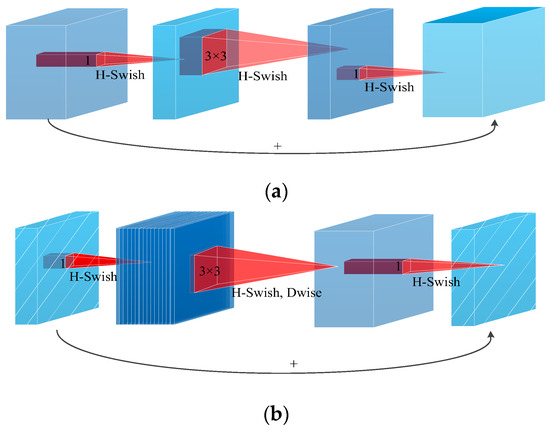 The MobileNetV3 feature extraction network adopts a 3 × 3 standard convolution and multiple inverted residual structures, which not only can reduce network parameters but also extract rich feature information. Among them, Figure 7a is the ResNet residual and Figure 7b is the reverse residual.