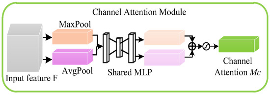 The CBAM consists of a channel attention module and a spatial attention module. The input features are inferred to contain attention features in sequence, and then the attention feature vector and the input feature vector are multiplied to achieve adaptive feature optimization. As shown in Figure 9, the channel attention vector is calculated along the spatial dimension to obtain the feature vector and is multiplied with the input feature. The channel attention mechanism is expressed in Formula (3):