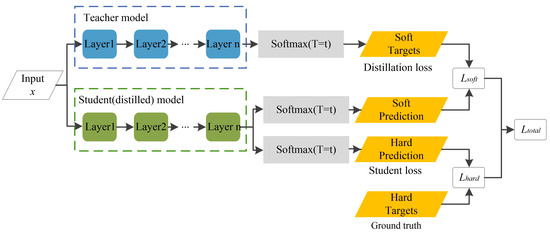 The technique of knowledge distillation is a widely adopted approach for compressing models, which differs from pruning and quantization in model compression. Essentially, knowledge distillation involves training a compact network model to emulate the knowledge extracted from a pre-trained larger network. This training methodology is commonly referred to as “teacher-student”, where the larger network is the “teacher network”, while the smaller network is the “student network”. The goal of knowledge distillation is to enable the student network to achieve comparable, if not better, accuracy than the larger network while having fewer parameters and a smaller scale. By distilling the model, the problem of slow speed and high memory consumption is resolved, while also enhancing model accuracy. The distillation process can be observed in Figure 11.