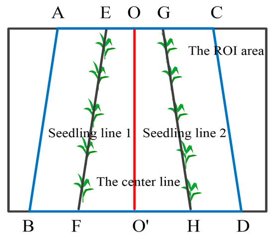 In order to determine the ROI of the crop rows in the image, the image is simplified to an imaging model under perspective projection, as shown in Figure 12. OO’ is the center line of the crop rows in the middle of the image, EF and GH are the center lines of the left and right seedling rows, and the quadrangle ACDB is the ROI area.