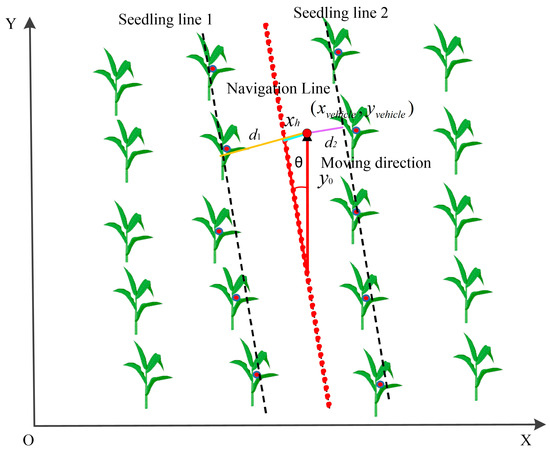 In agricultural reclamation areas, the standardization of crop rows is high, and inter-row weeds are cleared by controlling the lateral displacement of the weeding shovel of the inter-row weeder. Building upon the previous Section 2.5.3 on crop row fitting, the next step involves determining the centerline of two crop rows. The diagram illustrating the position relationship between the weeding machine and the crop rows is shown in Figure 14. This can be achieved by obtaining the average of the fitted lines of the two crop rows to derive the navigation centerline, as shown in Formula (18):
