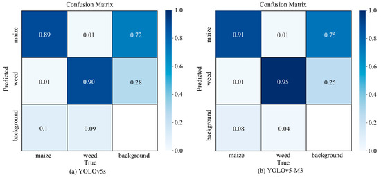 Based on the confusion matrix plots of YOLOv5s and YOLOv5-M3 in Figure 16, which are used for classifying images into three categories: maize, weed, and background, the following observations can be made: