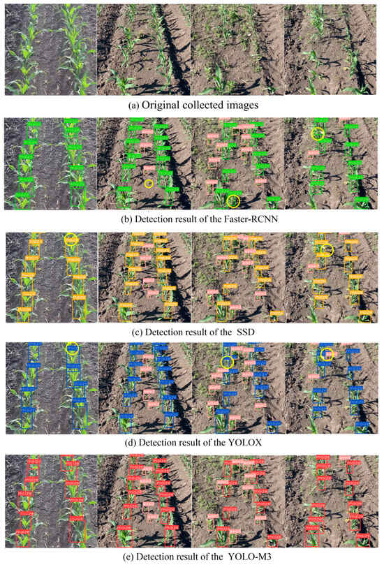The dataset also includes images of irregularly shaped maize seedlings or weeds. In the collected images, the distribution of crops and weeds is shown in Figure 17, mainly divided into four situations: weed-free areas, dense weed distribution, sparse weed distribution, and maize seedling missing areas. To demonstrate the superiority of our proposed model in detecting weeds and confirm the effectiveness of our improved YOLOv5-M3 network model, four typical images were chosen from various environments where weeds are dense, sparse, distant from crops, or multiple weed species coexist. A comparison was made with four classic models, namely Faster-RCNN, SSD, and YOLOX, and the detection results are presented in Figure 17b–e.