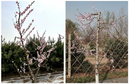 - Chanana, Y.; Kaur, B.; Kaundal, G.; Singh, S. Effect of flowers and fruit thinning on maturity, yield and quality in peach (Prunus persica Batsch). Indian J. Hortic. 1998, 55, 323–326. [Google Scholar]