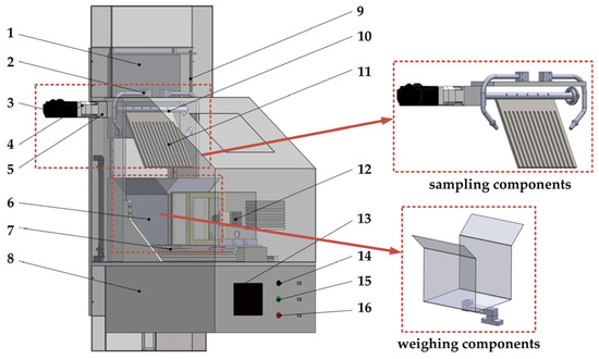Lint quantitative sampling device structure diagram as part of the processing chain: (1) negative-pressure adjustment plate, (2) nozzle, (3) servo motor, (4) moderator, (5) coupling, (6) cotton collection box, (7) weighing sensors, (8) electric cabinet, (9) cylinder, (10) rotary axis, (11) sample plate, (12) information detection device, (13) touchscreen, (14) power switch, (15) start button, (16) emergency switch.