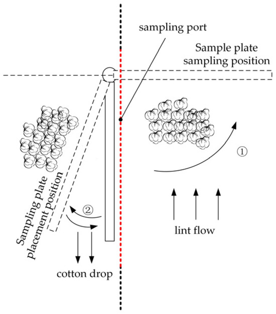 Cotton moisture and impurity rate are major factors influencing the stability and quality of the cotton processing system. Domestic and foreign scholars have conducted extensive research on cotton moisture and impurity rate detection. Regarding moisture detection, foreign Uster cotton online quality testing equipment was installed in the lint pipeline on an online sampling workstation to obtain cotton water content, impurities, and color information [2,3]. The Zhengzhou Cotton and Jute Engineering Technology and Design Research Institute has developed an online determination device for lint moisture regain. This device uses the resistance method to detect the moisture rate of cotton in real time. It consists of a detection electrode set, deflector plate, microprocessor, and display module. This device helps to improve the stability of cotton pressure and compactness during the detection process, resulting in more-accurate moisture rate measurements [4,5]. Xiao Zhonggao et al. [6] revealed a new device designed for the online testing of cotton. This device consists of a porous sampling plate, a sampling rotating shaft, and a motor. The sampling plate is positioned perpendicular to the direction of the cotton flow and driven by the motor to perform automatic sampling. This device enables automatic sampling and pressure during the online testing process, providing technical support for measuring the dampness rate of cotton. In terms of impurity detection, Wan Long et al. [7] created a machine-picked seed cotton acquisition link impurity detection system that used RGB double-sided imaging to obtain a single image then analyzed the image impurities to determine the proportion of the predicted impurity rate of seed cotton samples. Tian Hao [8] employed image threshold segmentation and connection region analysis techniques to quantify the pixel area occupied by cotton and impurities. Additionally, regression analysis was utilized to forecast the impurity rate of cotton. In their study, Wu Tingrong et al. [9] employed two distinct techniques to perform image segmentation, namely the maximum interclass variance approach and edge detection in conjunction with multiple operators. They then determined the impurity rate by calculating the pixel area share of the impurity region. In short, the study and implementation of technology for detecting moisture content and trash content in lint are quite advanced. However, due to the complex flow field environment in pipelines, the existing online cotton lint inspection device is unable to realize the quantitative removal of cotton samples and is unable to obtain the weight of cotton samples in the online inspection of cotton lint moisture and impurity content during processing. The result is that quality indicators such as cotton lint moisture and impurity cannot be quantitatively detected. The issue of testing accuracy being significantly influenced by variations in sampling weight requires immediate attention and resolution.