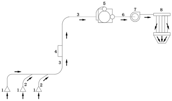 Pneumatic conveying throughout the whole process of cotton processing is the primary mode of transportation for seed cotton, lint, and other materials [27]. After the lint cleaning machine cleans cotton through the suction-type pneumatic conveying device, the cotton is sent to the baler in bales. The conveying device mainly comprises a lint suction nozzle, cotton collection branch pipe, cotton collection pipe, cotton collection machine, return air pipe, fan, dust collector, and other components and equipment, as shown in Figure 3.