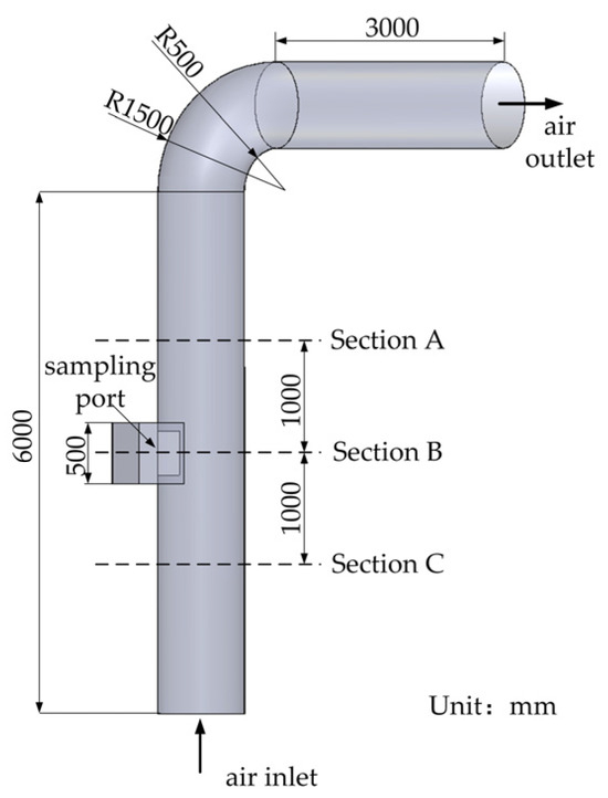 The flow field simulation analysis focuses on the selection of the lint main pipe and the return air pipe. To determine the airflow velocity and negative-pressure distribution within the lint pneumatic conveying pipeline under no-load conditions, a numerical simulation analysis of the flow field was conducted. This analysis provides the necessary boundary parameters for the air–solid coupling in the CFD–DEM system. Figure 4 displays the three-dimensional structural dimensions of the cotton conveying pipeline.