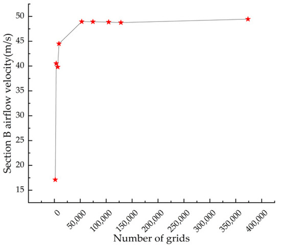 The mesh is the carrier of fluid simulation calculations, and the size and quantity of the mesh determine the accuracy and time of the solution. To verify the reasonableness of the simulation model’s mesh selection, this study meshed the cotton pipeline model with different densities; due to the large size of the model, a tetrahedral mesh was used to divide the model, and the mesh size was set by the proximity control function and the curvature control function; the mesh was fast using this mesh division, and at the same time, the model shape was regular, and the model could be reasonably divided by the edges and corners by these two control functions. The numbers of grids for the computational model were 1768, 3638, 6498, 8947, 52,822, 74,428, 104,737, 130,119, and 373,575. Figure 5 (the red stars are the data nodes; section B airflow velocity nodes correspond to different numbers of grids) represents the values of section B’s airflow velocity, monitored as the model grid is refined while other conditions are kept the same, and it can be seen from the figure that the airflow velocity at section B changes very little when the number of grids exceeds 100,000, which means that continuing to increase the number of grids has less influence on the calculation results, and it can be considered that the 130,119 grids already meets the simulation requirements.