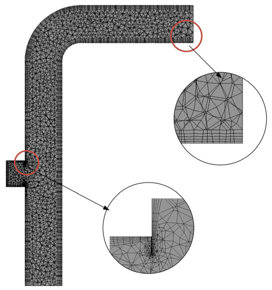 The cotton pipeline model was imported into Ansys Geometry and the fluid domain was delineated. Considering the shape and size of the model, the Proximity and Curvature function was used to mesh the model in Ansys Mesh, the Num Cells Across Gap was determined to be 8 layers, and the Curvature Normal Angle was determined to be 15°. Considering the boundary layer effect, the mesh near the pipe wall was encrypted in the thickness direction, Maximum Layers was set to 5 in Inflation, Growth Rate was set to 1.2, and Smooth Transition was selected in the Inflation Option to ensure a smooth transition of the mesh encryption; the mesh was divided as shown in Figure 6. As shown in Figure 6, the total number of meshes was 130,119, and the average value of Orthogonal Quality was 0.7136, which is more significant than 0.5, indicating that the quality of mesh division meets the requirements.