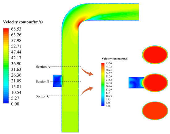 The velocity of the flow field is a significant characteristic of pneumatic conveying systems. By examining the changes in and distribution of the flow field velocity, one can accurately evaluate the average flow rate of gas and lint particles within the pipeline and determine the maximum flow rate. This analysis is crucial in determining the stability of the sampling device within the flow field and assessing its susceptibility to the impact of the fluent within the pipeline.