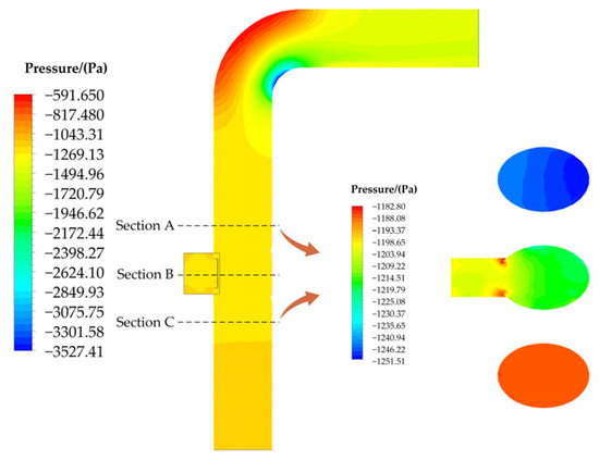 The mesh model was imported into FLUENT fluid simulation software, and based on the characteristic parameters of the cotton pipeline, the external atmospheric pressure was set as the standard value, i.e., 101,325 Pa, the relative pressure at the aerodynamic inlet was set to be 0 Pa, and the pressure at the aerodynamic outlet was set to be −2000 Pa (the centrifugal blower provided negative pressure). Relying on the k–epsilon (2 eqn) turbulence model calculations to obtain the airflow in the pipe, the residuals of each index are below 10−4, and the calculation results converge. The simulation results are shown in Figure 7 and Figure 8. After analysis, it can be seen that the average airflow velocity is 42.15 m/s and the average pressure is −1297.71 Pa when the pipeline is unloaded, and the maximum velocity is 45.2 m/s and the maximum pressure is −1182.80 Pa near the sampling port; the airflow velocity and pressure inside the pipeline tend to be uniformly distributed when the pipeline is unloaded, which contributes to the stable transportation of cotton lint. Meanwhile, the average velocity at the velocity inlet (section C) is 43.7 m/s, and the average pressure at the pressure outlet (section A) is −1247.75 Pa, which provides a theoretical basis for the parameter setting of the boundary conditions in the simulation of the cotton lint pneumatic conveying process by CFD–DEM.