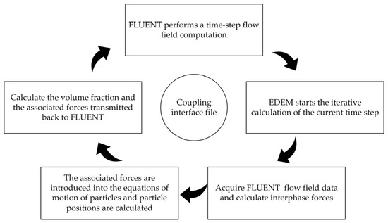 In this EDEM–FLUENT coupled simulation test, we utilized FLUENT 2021 R1 and EDEM 2022 software to conduct the coupled simulation. The Eulerian–Lagrangian coupling model is chosen not only to realize the momentum exchange between the gas term and the lint particle term but also to take into account the effect of the particle volume on the gas continuum term, which can accurately analyze the interaction between the two gas–solid flows. The coupled flow process is shown in Figure 9. First, FLUENT iteratively calculates the time step of the airflow field. Suppose the current time step converges or reaches the preset number of iterative steps. In that case, the airflow force is applied to EDEM by compiling the coupling interface file, affecting the particle motion. Meanwhile, EDEM performs iterative calculations of the same time step by the discrete element method and imports the particle volume, position, and velocity information into FLUENT through the coupling interface, thereby calculating the interaction between the particles and the flow field. The entire coupling simulation process is achieved by iterating the calculation until the set convergence value is reached.