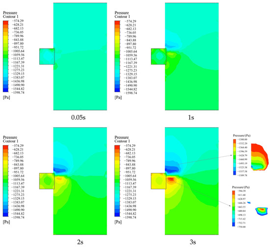 The role of a negative-pressure centrifugal fan in the cotton pipeline involves the conveying of gas and lint particles. The interaction forces between these components are considered, and the flow field pressure is analyzed to evaluate the speed and stability of lint particle transport and the accumulation of particles in the sampling link. Additionally, the movement characteristics of the particles during the conveying process can be predicted. Therefore, an analysis of the flow field pressure at different moments during the re-sampling process of the cotton pipeline is conducted. Without sampling in the online detection device pipeline’s flow field, the pressure remains stable at an average value of −1247.75 Pa. However, when the sampling plate is introduced into the pipeline, the pressure distribution along the pipeline is analyzed at specific time intervals of 0.05 s, 1 s, 2 s, and 3 s. These results are visually represented in Figure 10.