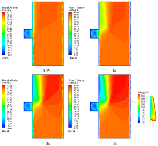 When the sampling plate is inserted into the online detection device without initiating sampling, the gas flow rate in the pipeline remains in a stable state, with an average steady flow rate of 43.7 m·s−1. However, when the sampling plate is suspended in the pipeline and sampling is initiated, the gas flow rate distribution in the pipeline is analyzed at specific time intervals of 0.05 s, 1 s, 2 s, and 3 s. The corresponding results are depicted in Figure 11.