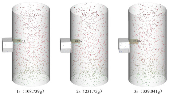 The lint particles enter the negative-pressure cotton pipeline from the velocity intake with an initial velocity of 12 m/s in the linked simulation analysis. The cotton processing factory produces 27 bales of cotton lint each hour, and the total lint production is 6080 kg/h. Therefore, the simulated lint particle creation rate is 1.69 kg/s [32], consistent with actual production conditions. The movement of lint particles in the negative-pressure cotton pipeline under this condition was analyzed numerically to identify the sampling process of lint particles as the movement speed changes and the impact on the sample plate’s sampling.