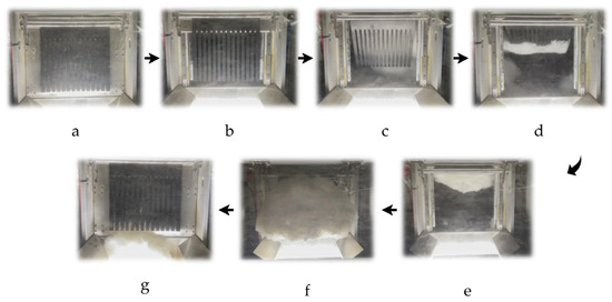Test flow chart. (a) starting position, (b) sampling port open, (c) sample plate rotated 90° counterclockwise, (d) sample board stay, (e) cotton sample piling up, (f) sample plate rotated 120° clockwise, (g) getting cotton weight.