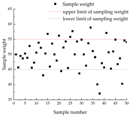 We repeated the sampling test 50 times and weighed the sample weight statistics; the results are shown in Figure 17. According to the national standard GB/T 6102.2-2012 [33] raw cotton dampness test method, the sample quality is 50 ± 5 g. The test statistics show that the weight of the sample taken out is between 45~55 g. There are 43 groups, and the sampling qualification rate is 84%, which meets the sampling requirements.
