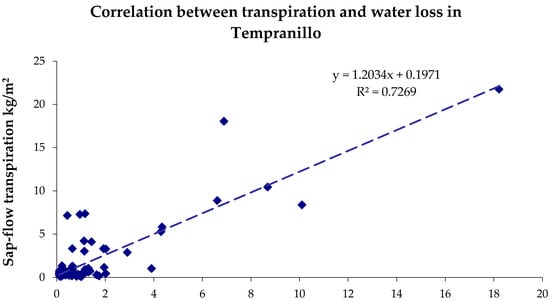 Sap flow measurements were performed using 6 sensors. Each sensor was installed on a branch of a different vine, resulting in 3 sensors in each treatment (irrigated and non-irrigated). Before installation in the field, the device was calibrated using Tempranillo plants grown in containers. The containers were weighed every half hour for two days to determine the loss of water from the turrets by transpiration, and at the same time, transpiration data were collected with the sap flow (kg/m2 of water transpired). The soil surface of the containers was covered so that the difference in weight between measurements was due solely to the transpiration of the plant and not to the evaporation of water from the soil.