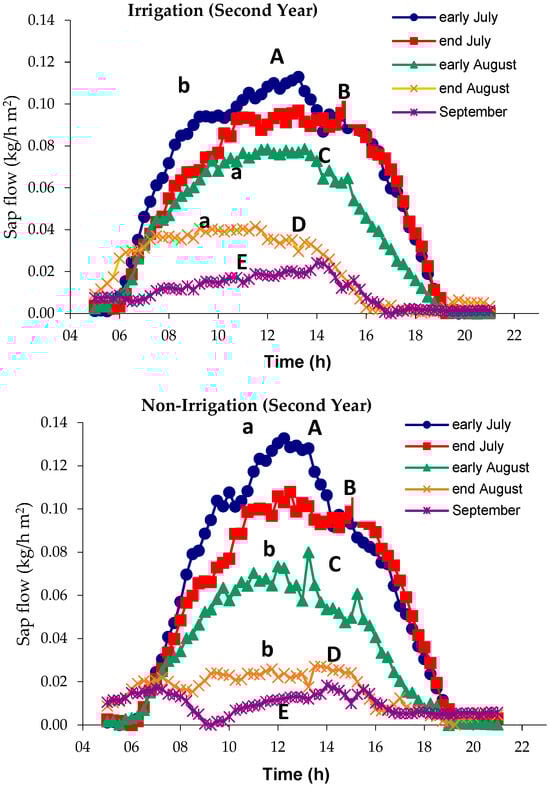 Daily cycles of sap flow corresponding to irrigation and non-irrigation treatments. The curves correspond to three distinct phases during the summer of the second year: the onset of veraison, the conclusion of veraison, and the completion of the ripening process. Lowercase letters show statistically significant differences between irrigation and non-irrigation treatments. Capital letters show statistically significant differences between measured points of the growing cycle: early July, end of July, early August, end of August, and September.