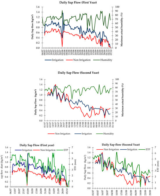 When evaluating the influence of the relative humidity of the air on the flow of sap (Figure 4), a close relationship is observed, since transpiration always increases in both treatments when the relative humidity decreases. Plants show the opposite behavior when humidity increases. The transpiration values of the plants responded to the changes caused by the evaporative demand. The transpired water in the two treatments was identical in the first month of measurements in year 2, coinciding with the wet period (July). During the driest periods (summer of the first year and August of the second), evapotranspiration was higher than transpired water, as expected. When there is accumulated water in the soil, practically all the ET0 is equivalent to the water transpired by the plant. The transpiration per unit area was found to increase linearly with ET0, with differential relationships for the irrigated and non-irrigated plants. For a given value, the ET0 transpiration per unit leaf area of the control plants was lower than that of the irrigated plants, because of the stomatal closure in response to the water deficit in the non-irrigated plants [58]. The more stressed the plants are, the more their transpiration decreases, and therefore, the difference with the watered plants is greater. In the first year, characterized by severe drought, the non-irrigated plants transpired 46% less than the irrigated ones, since the soil did not accumulate water and the irrigated plants used what had been supplied with the irrigation. In the second year, the total amount of water used by the plant (T) (Table 2), especially when comparing the non-irrigated treatments, was higher, as expected, considering that the sum of the irrigation and precipitation of the period was higher.