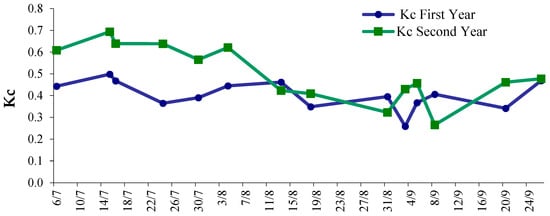 Figure 6 shows the evolution of the crop coefficients, Kc, calculated for the two years of the study. The crop coefficients decrease from 0.45 and 0.60 in the first week of July in the first and second year, respectively, to 0.35 and 0.45 at harvest time. The values are generally higher in the humid year, as expected, due to the greater availability of water.