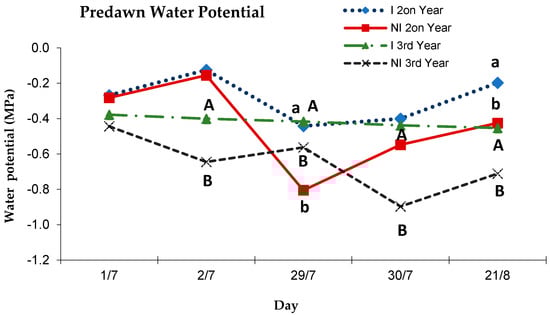 Evolution of predawn water potential (MPa) throughout the summer of the second and third years of study in Tempranillo vines. I: irrigation, NI: non-irrigation. Letters show statistically significant differences between irrigation and non-irrigation in the 2nd (lowercase letters) and 3rd years of study (capital letters).