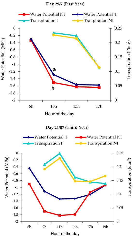 Daily cycle of transpiration (measured with Licor) and water potential (in MPa) of Tempranillo leaves in irrigation and non-irrigation treatments. Days 29/7 first year and 21/7 third year. Letters signify statistically significant differences between irrigation and non-irrigation.