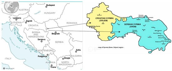 The subject of this research is the cooperation on the cross-border project entitled “Authentic Gourmet Taste for Sustainable SocioEconomic development of the Cross-Border Region–Pannonia Gourmet”, approved for funding from the Interreg-IPA CBC program, Croatia–Serbia 2014–2020. Even though the deadline for its completion was in 2021, due to the well-known COVID situation in 2020, the project was completed in 2022. The distinct objective of this project was to enhance, broaden, and unify the cross-border tourism offerings while also enhancing the management of cultural and natural heritage assets. The research areas were Croatian Syrmia, City of Vinkovci, and Serbian Syrmia, Municipality of Irig–Vrdnik (Figure 1).
