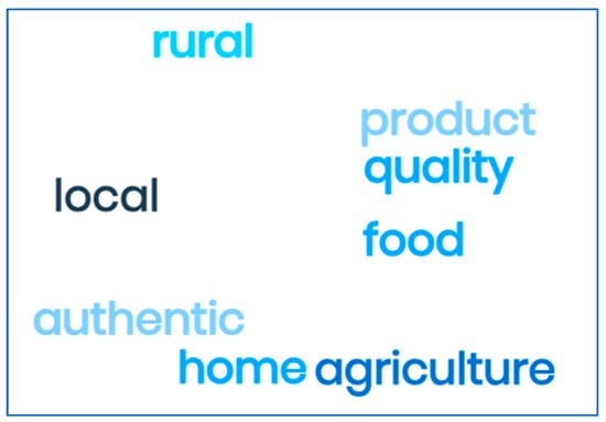 Due to the contextual and functional similarity of both Table 4 and Figure 3, the analysis was conducted together. In general, all respondents had the same attitude when asked about the importance of the “Eat Pannonia” brand from a general perspective in their business. Despite being the focus of this research, the words “food”, “product”, and “quality” were undoubtedly a relevant topic that was analyzed. This turned out to be an important or even fundamental aspect. Words like “local” and “agricultural” were obviously common because of the general theme. “Agricultural” was introduced in the contexts of “home” and “authentic”. Accordingly, the word “local” appeared as one of the most frequently used, because the local product is at the center of this research and is crucial to culinary application in tourism.
