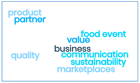 - The terms “food event”, “business”, “communication”, “sustainability”, “value”, and “marketplaces” are clearly interconnected and represent the importance of production owners or managers.