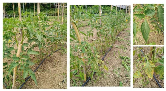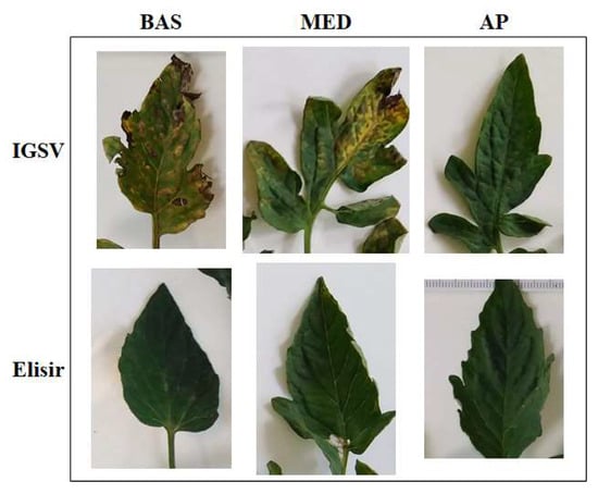 IGSV line (breeding code V20368) produces tomato plants with necrotic leaf spots mimicking disease lesions []. Plants have indeterminate growth and produce slightly flattened globular fruits. To have a healthy reference for the characterization of leaf symptoms, the F1 hybrid Elisir (Olter) has been identified as a comparison genotype.