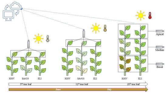 The necrosis began to be visible approximately one month after transplanting. When the plants were at the stage of 5th and 12th true leaf, the VIS/NIR monitoring was applied to the apical green leaf of Elisir, IGSV, and SA410. To this aim, we used the portable and low-cost VIS/NIR spectrometer SCIOTM (Consumer Physics, Tel Aviv, Israel), covering a spectral range between 740 and 1070 nm []. On both the 5th and 12th true leaves, three leaflets (the imparipinnate and the two leaflets below) from three plants of each genotype were considered. Three readings were taken on each leaflet.