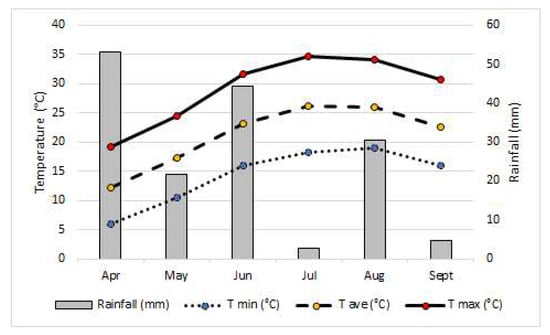 Minimum, average, and maximum temperatures and monthly rainfall registered in the period April–September 2021. Data collected by the Arsial control unit of Monterotondo (RM), location: Grotta Marozza (92 m asl) (https://www.siarl-lazio.it/E1_2.asp, accessed 16 November 2023).