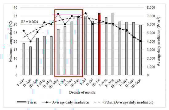 Maximum temperatures (bars) and average daily irradiation (solid line) registered per decade in the period April–September 2021. The dotted line represents the interpolation of the average daily irradiation data. Data collected by the Arsial control unit of Monterotondo (RM), location: Grotta Marozza (92 m asl) (https://www.siarl-lazio.it/E1_2.asp, accessed 16 November 2022). The red square indicates the period from transplant to the first appearance of necrotic specks. The red bar indicates the period when the leaves were collected.